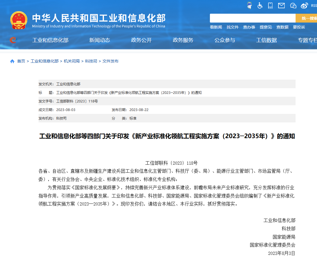 到2035年,滿足新產業高質量發展需求的標準供給更加充分,企業主體、政府引導、開放融合的新產業標準化工作體系全面形成。新產業標準化發展基礎更加鞏固,以標準引領新產業高質量發展的效能全面顯現,為基本實現新型工業化提供有力保障。