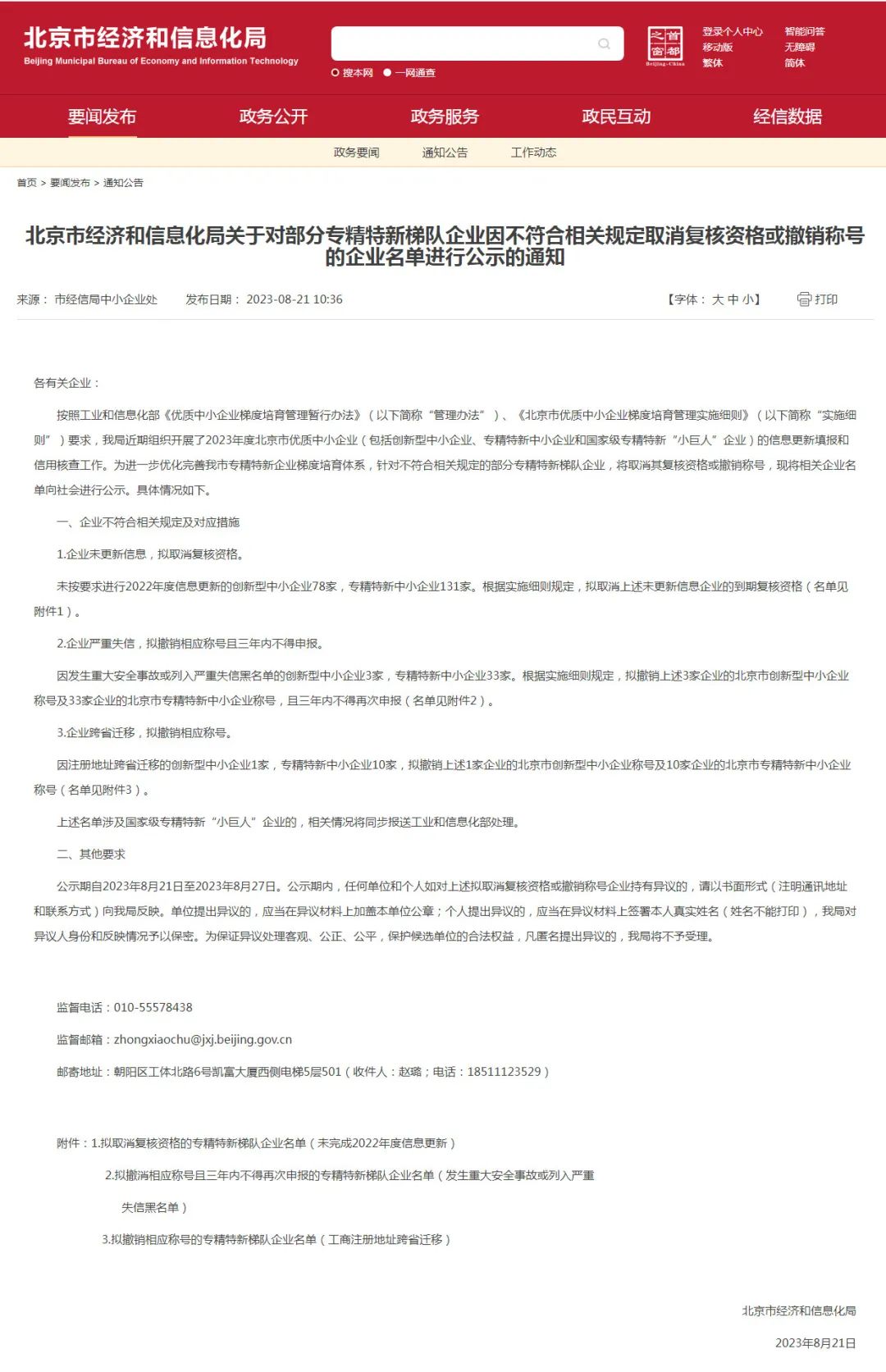8月21日,北京市經(jīng)信局官網(wǎng)公布消息顯示,為進(jìn)一步優(yōu)化完善北京市專精特新企業(yè)梯度培育體系,針對(duì)不符合相關(guān)規(guī)定的部分專精特新梯隊(duì)企業(yè),將取消其復(fù)核資格或撤銷(xiāo)稱號(hào),并將相關(guān)企業(yè)名單向社會(huì)進(jìn)行公示。公示名單共涉及北京174家專精特新中小企業(yè)和82家創(chuàng)新型中小企業(yè)!