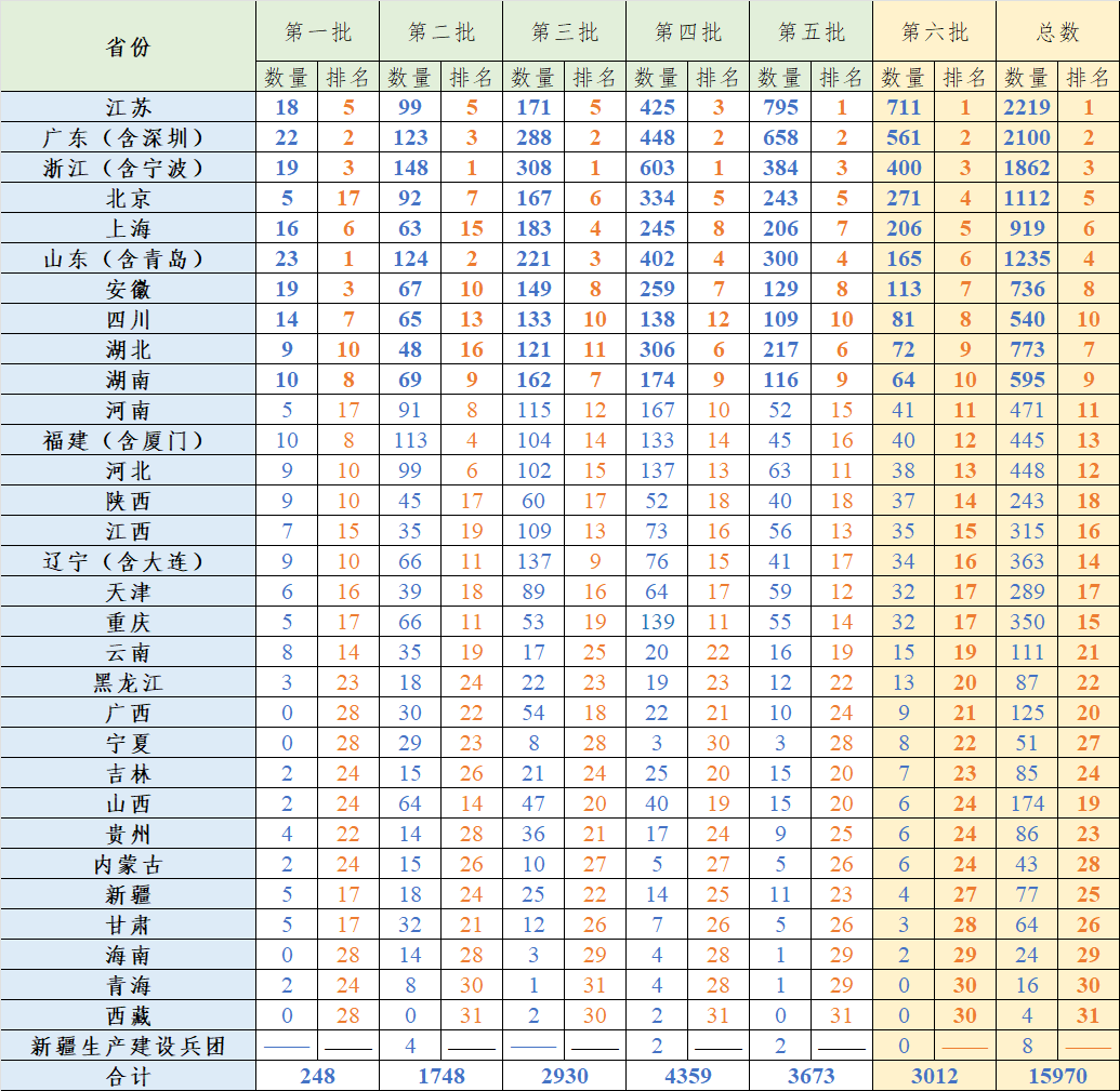第六批“小巨人”企業(yè)公示數(shù)量3012家,比第五批的3673家減少650余家,大部分省市立項(xiàng)數(shù)量較前批次也都出現(xiàn)了不同程度的下降(參見(jiàn)圖1)。近年來(lái),我國(guó)小巨人培育遴選工作呈現(xiàn)以下特征: