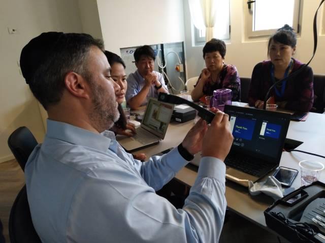 在考察中,Lumus公司的首席產(chǎn)品官Dr. Eli Glikman向考察團詳細介紹了該公司的波導式AR光學方案,考察團成員紛紛試戴了其AR光學眼鏡,切身感受了AR技術(shù)的魅力。