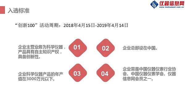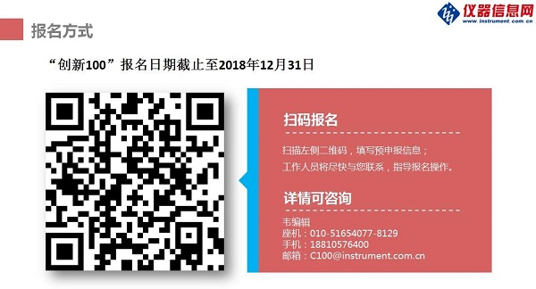 后續(xù),“創(chuàng)新 100”還將繼續(xù)走訪報(bào)道北京、天津、深圳、福建、江浙滬等地的儀器廠商,通過篩選“科學(xué)儀器行業(yè)最具成長潛力企業(yè)”、撰寫中小儀器企業(yè)創(chuàng)新能力調(diào)研報(bào)告等形式,依托儀器信息網(wǎng)媒體資源,形成“創(chuàng)新 100”企業(yè)傳播的倍增效應(yīng)。“創(chuàng)新 100”申報(bào)截止至 2018 年 12 月 31 日,歡迎符合如下條件的儀器企業(yè)積極申報(bào)。