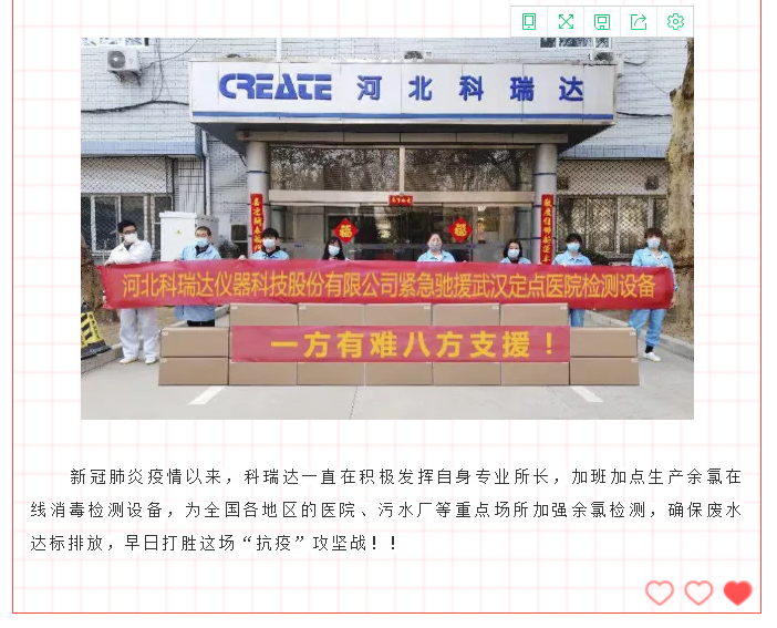 2月9日,第一時間與園區(qū)領導申請復工復產。加班加點,生產余氯在線分析儀,2月12日派物資專車馳援武漢,2月13日到達龔家?guī)X收費站,完成無接觸交貨;
