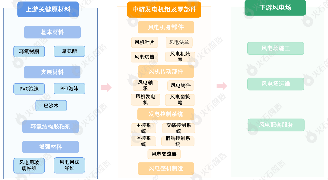 從風(fēng)電產(chǎn)業(yè)鏈看,上游包括環(huán)氧樹(shù)脂和聚氨酯等基本材料、PVC泡沫和巴沙木等夾層材料、以及環(huán)氧結(jié)構(gòu)膠粘劑、增強(qiáng)材料等;中游包括風(fēng)電機(jī)身部件、風(fēng)電傳動(dòng)部件、發(fā)電控制系統(tǒng)和風(fēng)電整機(jī)制造等;下游包括風(fēng)電場(chǎng)施工、運(yùn)維即配套服務(wù)等。