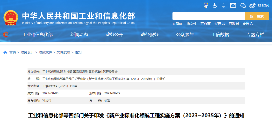 工業(yè)和信息化部等四部門關(guān)于印發(fā)《新產(chǎn)業(yè)標(biāo)準(zhǔn)化領(lǐng)航工程實施方案(2023─2035年)》的通知