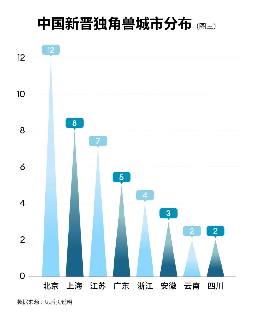 地區(qū)來看,2023年,北京創(chuàng)造了獨角獸總數(shù)的近三分之一,時隔一年反超上海、廣東重回第一。北京新增的獨角獸中近6成與人工智能技術(shù)密切相關(guān);上海則是機(jī)器人相關(guān)的獨角獸繼續(xù)發(fā)力,如智元機(jī)器人與達(dá)闥機(jī)器人等均在今年獲得巨額融資。