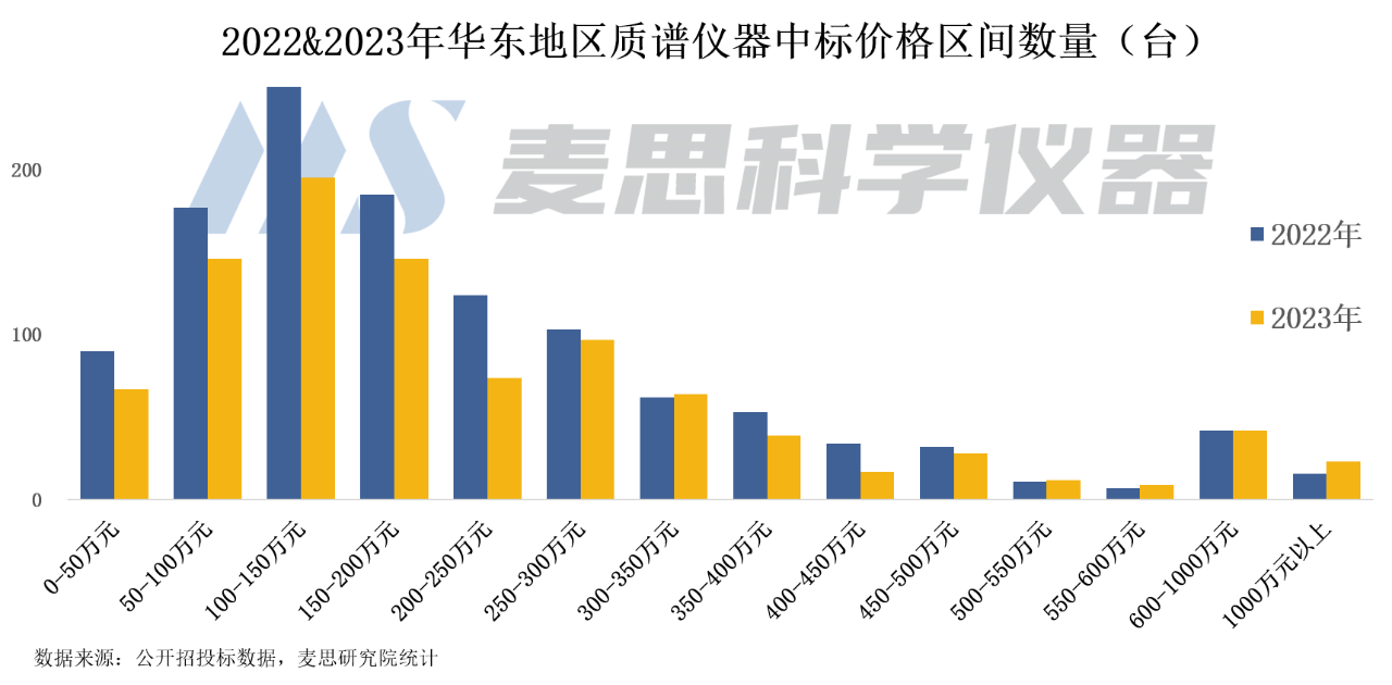 從各價格區間的中標數量來看,華東地區質譜儀器中標單價主要集中在350萬元以內,占比超80%。其中,中標單價在100-150萬元以內的質譜儀器數量最多,2023年中標數量占比為20%;其次為50-100萬元以及150-200萬元的質譜儀,占比均為15%。
