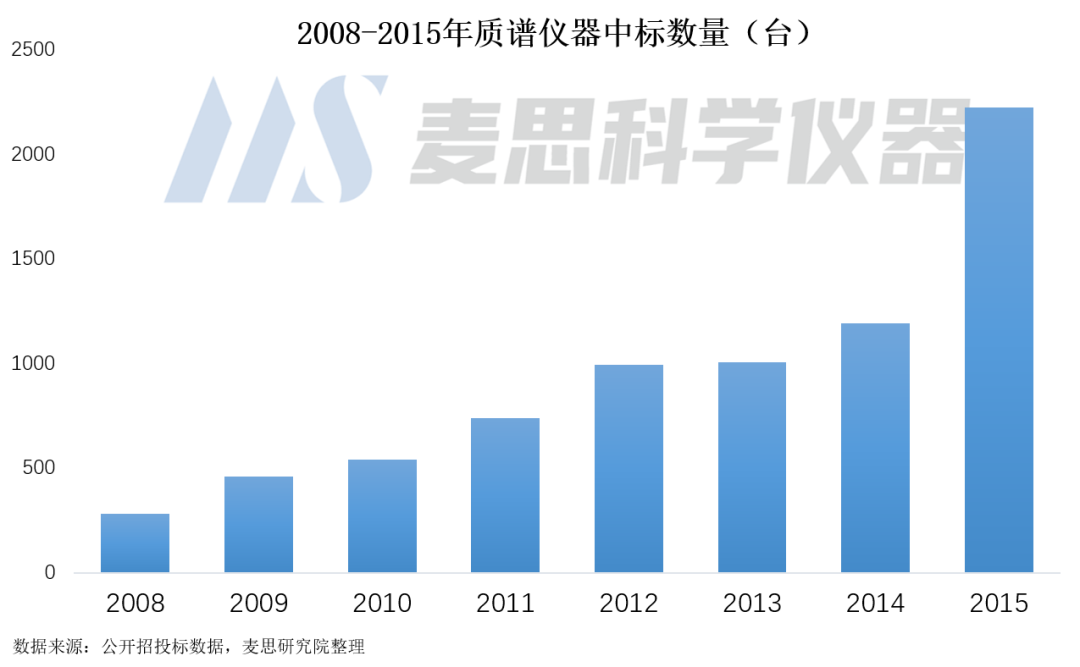 數(shù)據(jù)分析顯示,2008-2015年間,招投標(biāo)市場上采購了約7500臺質(zhì)譜儀,如果加上標(biāo)外市場,國內(nèi)質(zhì)譜儀采購量超1萬臺。