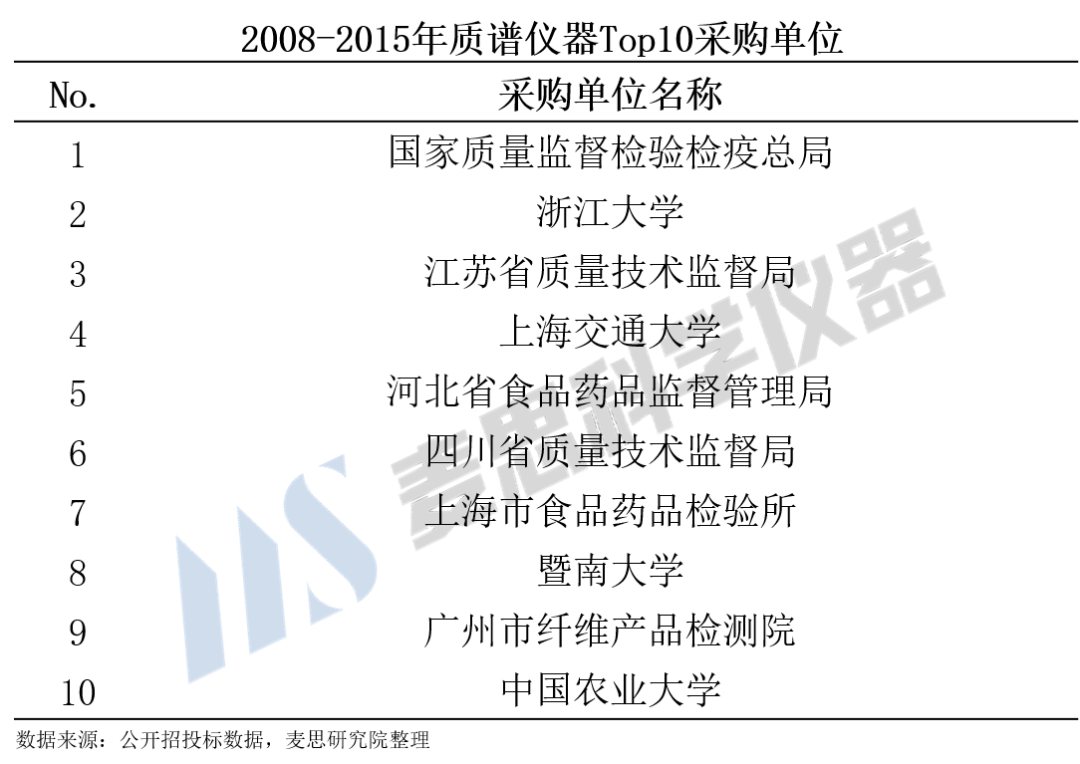 2008-2015年質(zhì)譜儀器中標(biāo)數(shù)量Top 3領(lǐng)域依次為教育、質(zhì)檢計量和科學(xué)研究領(lǐng)域,三者占比約為60%。在采購量最大的前十名用戶中,包括國家質(zhì)量監(jiān)督檢驗檢疫總局、浙江大學(xué)、江蘇省質(zhì)量技術(shù)監(jiān)督局等單位。