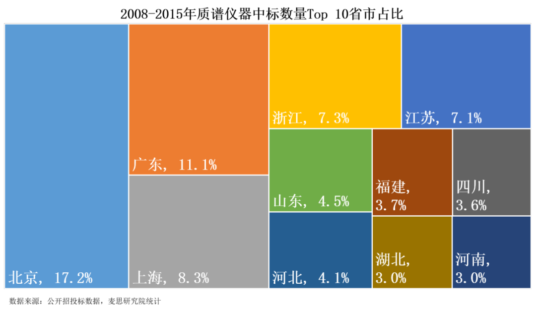 從地理區(qū)域分布來看,北京、廣東、上海、浙江和江蘇是2008-2015年間質(zhì)譜儀器的五大采購區(qū)域,這些地區(qū)的中標(biāo)數(shù)量合計占全國市場的一半以上。