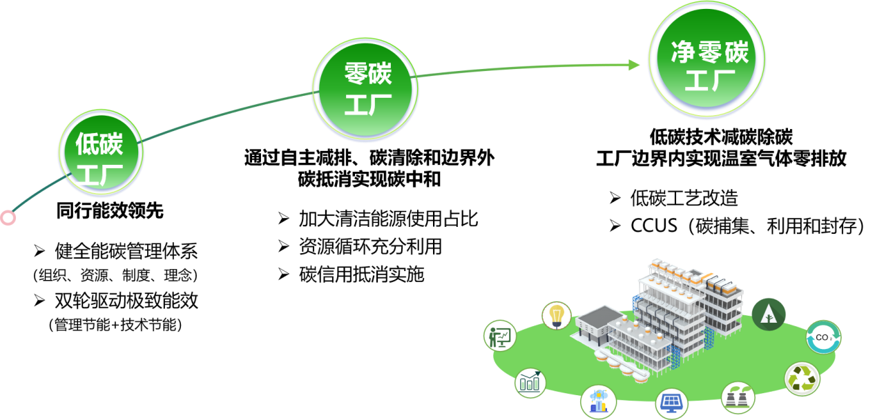 PhaseⅡ—零碳工廠:在低碳工廠的基礎上進一步通過能源結構調整、資源循環利用、碳清除、碳抵消等方式實現整體對外溫室氣體排放為零。