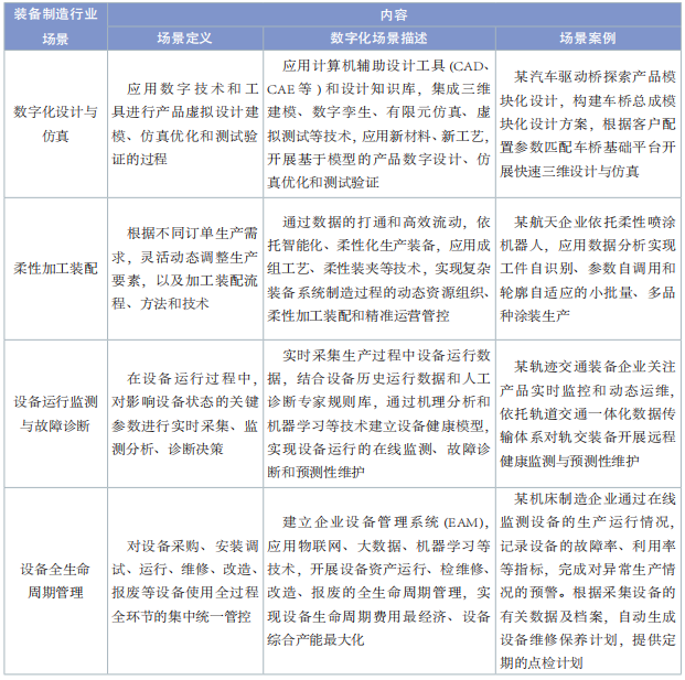 裝備制造包括通用裝備制造、專用裝備制造、汽車制造、鐵路、船舶、電氣機械、航空航天等行業門類,以離散制造為主。裝備制造行業數字化轉型要聚焦知識工程、AR/VR、數字孿生、可重構生產、人工智能等新技術和產品遠程運維、數據驅動服務、柔性敏捷生產等典型場景,打造高效柔性、敏捷響應、人機協同和動態調度能力,不斷優化裝備產品性能和服務水平。基于此,整理出數字化設計與仿真、柔性加工裝配、設備運行監測與故障診斷、設備全生命周期管理 4 個典型場景,詳細場景內容見表 2。