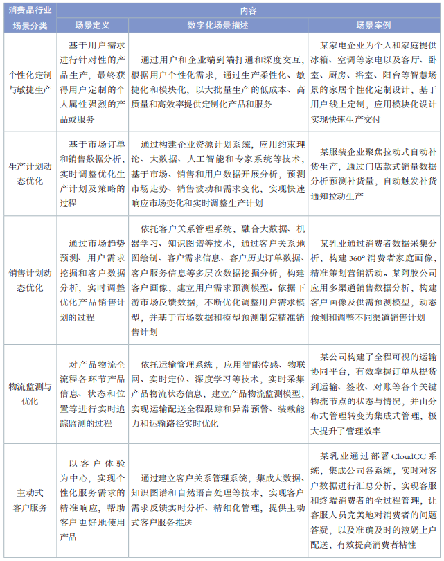 消費品包括食品飲料、 生物醫藥、 家電服裝、家居日化等行業門類,涵蓋離散制造和流程制造,以客戶為中心組織生產是行業主要特點。消費品行業數字化轉型要聚焦人工智能、區塊鏈、數字孿生等新技術和大規模個性化定制、銷售驅動業務優化等典型場景,打造以用戶需求為中心的制造體系,提升全生命周期質量管控、需求敏捷感知和產銷用協同能力。基于此,本文整理出個性化定制與敏捷生產、生產計劃動態優化和銷售計劃動態優化、物流監測與優化等 5 個典型場景,詳細場景內容見表 4。