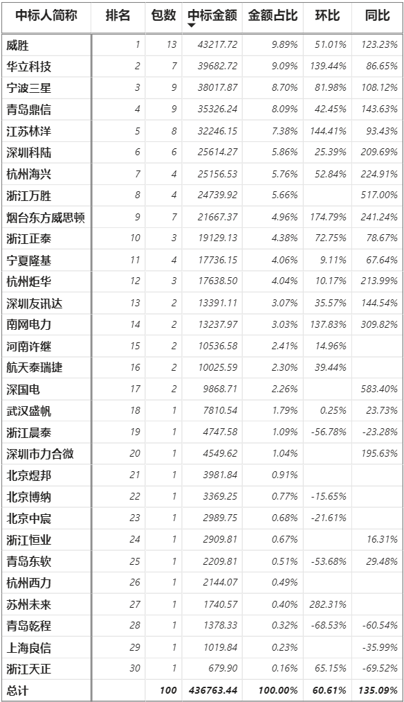 總金額43.68億元,30家企業(yè)實現(xiàn)中標(威勝集團+威勝信息計為1家,正泰電器+正泰儀表計為1家),威勝以4.32億元位列各企業(yè)第一名,華立中標3.97億元第二,三星3.80億元第三,鼎信3.53億元第四。