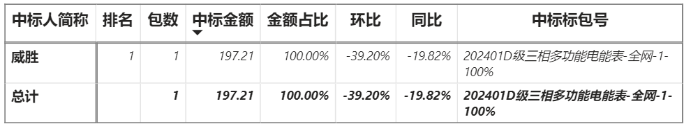 總金額197.21萬元,1家企業(yè)實現(xiàn)中標,威勝中標197.21萬元;