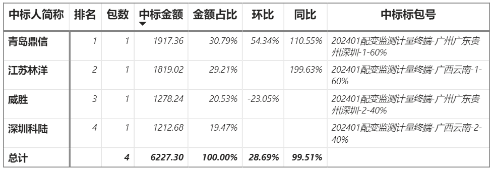 總金額6227.30萬元,4家企業(yè)實現(xiàn)中標,鼎信中標最大包1917.36萬元;