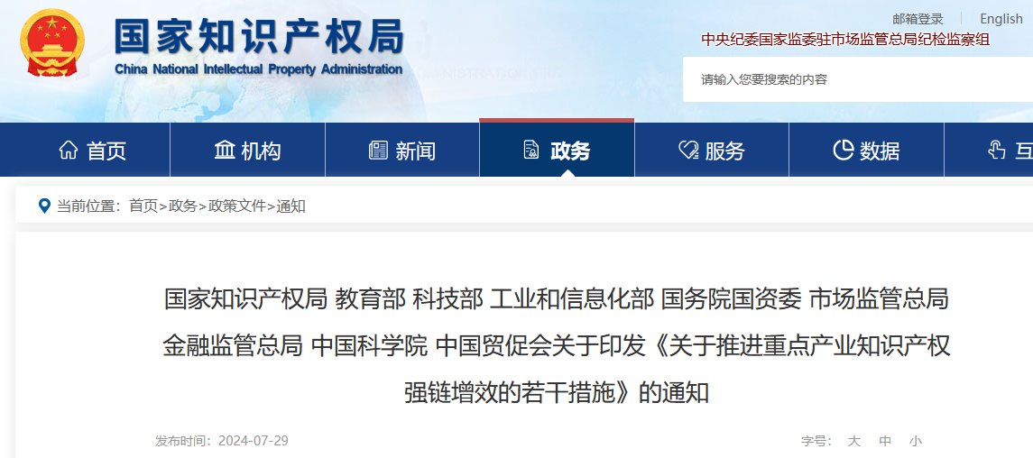 國家知識產(chǎn)權(quán)局 教育部 科技部 工業(yè)和信息化部 國務(wù)院國資委 市場監(jiān)管總局 金融監(jiān)管總局 中國科學(xué)院 中國貿(mào)促會關(guān)于印發(fā)《關(guān)于推進重點產(chǎn)業(yè)知識產(chǎn)權(quán)強鏈增效的若干措施》的通知