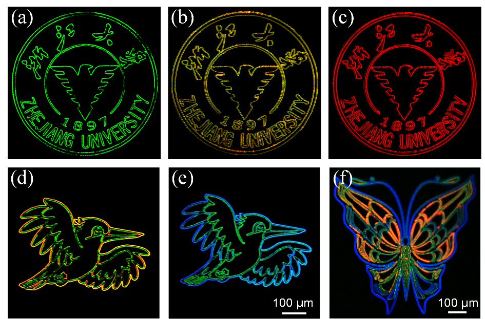 圖3(a)~(c)在玻璃內(nèi)部直寫(xiě)不同顏色的浙江大學(xué)校徽,(d)~(f)納米晶彩色圖案直寫(xiě)