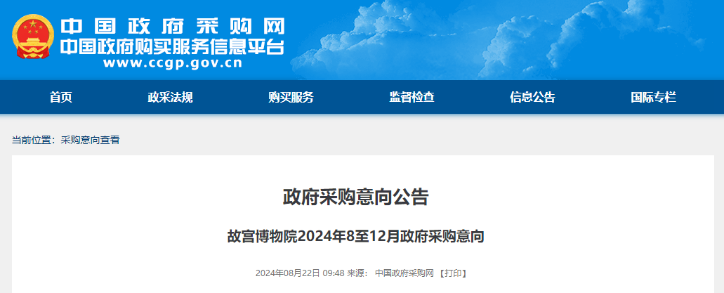 故宮博物院2024年8至12月政府采購意向