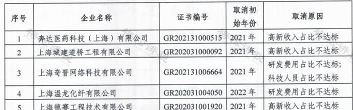 取消原因包括:注銷;研發費用占比不達標;科技人員占比不達標;未正常開展經營活動;累計2年未填報年度發展報告等。