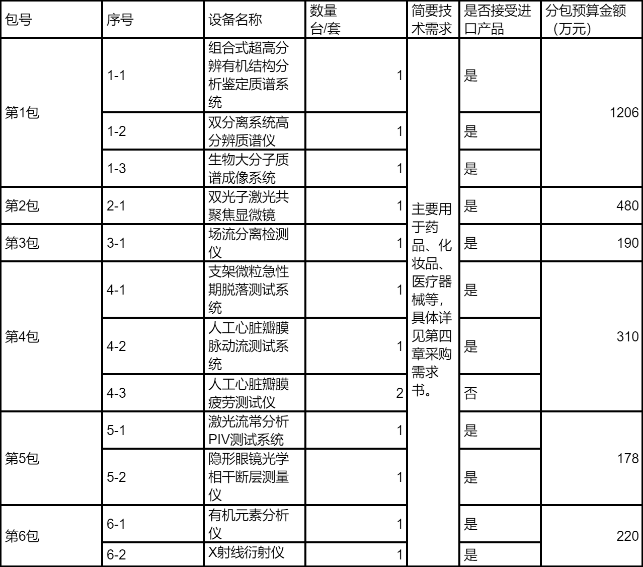 (1)包件1:1-1組合式超高分辨有機(jī)結(jié)構(gòu)分析鑒定質(zhì)譜系統(tǒng):486萬元;1-2雙分離系統(tǒng)高分辨質(zhì)譜儀:360萬元;1-3生物大分子質(zhì)譜成像系統(tǒng):360萬元。