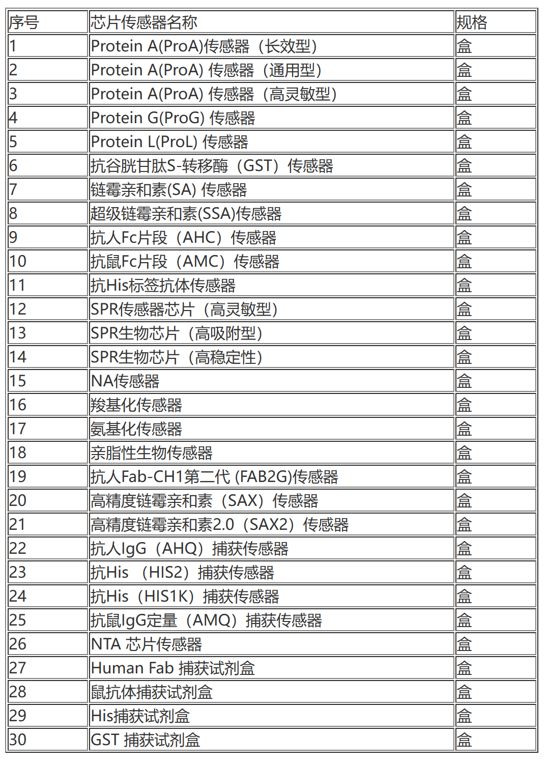 值得留意的是,本次采購的貨物表面等離子共振分子互作儀對配套的40個(gè)芯片試劑盒列出了詳細(xì)清單,以滿足用戶依據(jù)研究課題方向自由組合的需求。