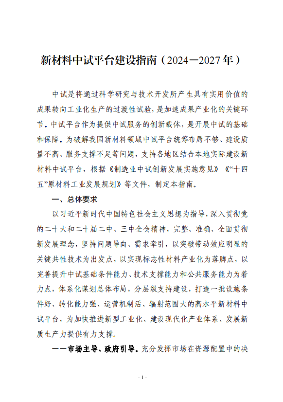 現(xiàn)將《新材料中試平臺建設(shè)指南(2024—2027年)》印發(fā)給你們,請結(jié)合實際認真抓好落實。