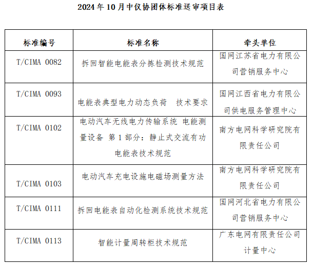 2024年10月 24-25日,中國儀器儀表行業(yè)協(xié)會(以下簡稱“協(xié)會”) 以視頻會議形式組織召開了《電能表典型電力動態(tài)負(fù)荷 技術(shù)要求》等6項(xiàng)團(tuán)體標(biāo)準(zhǔn)(項(xiàng)目信息詳見附表)送審稿審查會。來自國網(wǎng)山東省電力公司電力科學(xué)研究院、廣東電網(wǎng)有限責(zé)任公司計(jì)量中心、中國電力科學(xué)研究院計(jì)量研究所、國網(wǎng)浙江省電力有限公司營銷服務(wù)中心、廣西電網(wǎng)計(jì)量中心、中國電力科學(xué)研究院有限公司、國網(wǎng)河南省電力公司營銷服務(wù)中心、國網(wǎng)山東省電力公司、黑龍江省電工儀器儀表工程技術(shù)研究中心有限公司的九位專家組成審查組,國網(wǎng)山東省電力公司電力科學(xué)研究院的徐民教授級高工擔(dān)任組長。會議由協(xié)會副秘書長程紅主持。協(xié)會及電工儀表分會的團(tuán)體標(biāo)準(zhǔn)工作人員、標(biāo)準(zhǔn)主要起草人參加了本次會議。