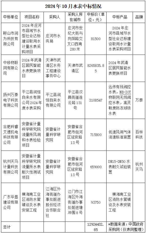 2024年10月,全國各地水表采購項(xiàng)目中標(biāo)情況揭曉,多家企業(yè)在激烈的市場競爭中脫穎而出,成功中標(biāo)各自領(lǐng)域的項(xiàng)目。根據(jù)中國政府采購網(wǎng)公布的數(shù)據(jù),10月水表采購總金額高達(dá)12924432.85元,涵蓋了節(jié)水型社會建設(shè)、智能水表更換、水表采購及檢驗(yàn)等多個(gè)方面。