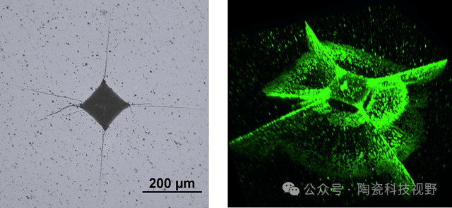 將方形金字塔形金剛石壓頭(維氏壓頭)壓入陶瓷表面,人為地引入壓痕和裂紋。使用普通金相顯微鏡觀察反射圖像時,只能在暴露于表面的區域觀察到裂紋,如下圖左所示,為此,研究團隊開發了一種在室溫和大氣壓下使用激光熒光顯微鏡從表面沿深度方向觀察熒光圖像的技術。