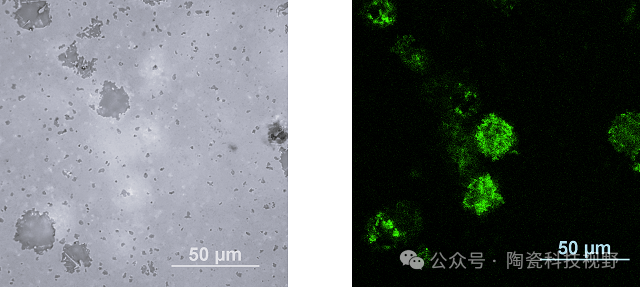 使用激光熒光顯微鏡觀察到的與左圖相同區域的熒光圖像,位于表面以下約3 µm(右)