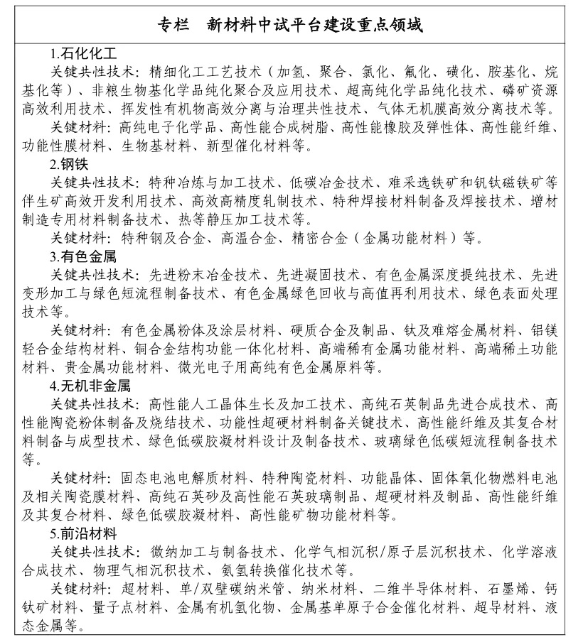 文件也進(jìn)一步明確了新材料中試平臺建設(shè)重點領(lǐng)域,詳情如下所示: