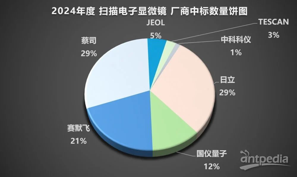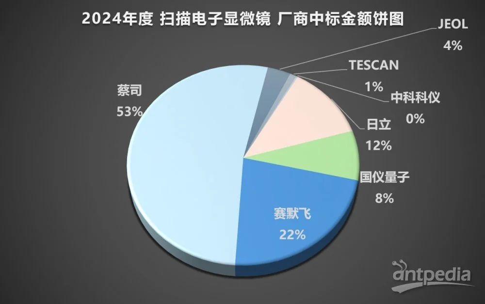 2024年度掃描電子顯微鏡主要品牌包括蔡司、賽默飛、國儀量子、日立、JEOL等。總金額為3.45億元,占總金額的96%。