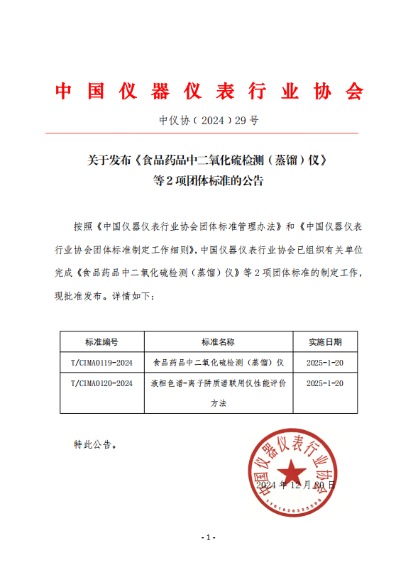 根據(jù)《中國儀器儀表行業(yè)協(xié)會團(tuán)體標(biāo)準(zhǔn)管理辦法》的規(guī)定,中國儀器儀表行業(yè)協(xié)會(簡稱“協(xié)會”)組織完成了由上海赫冠儀器有限公司提出的《食品藥品中二氧化硫檢測(蒸餾)儀》和由常州磐諾儀器有限公司提出的《液相色譜-離子阱質(zhì)譜聯(lián)用儀性能評價方法》2項(xiàng)團(tuán)體標(biāo)準(zhǔn)的制定工作,現(xiàn)予以發(fā)布,特此公告。