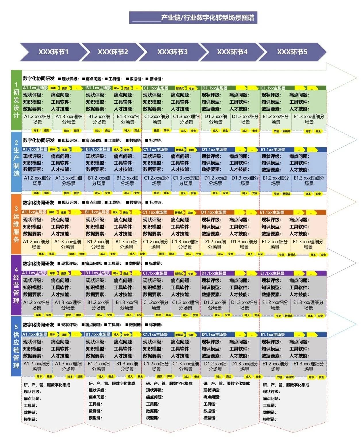 聚焦產(chǎn)業(yè)鏈上下游企業(yè)研發(fā)設計、生產(chǎn)制造、運維服務、經(jīng)營管理、供應鏈管理等場景,以場景為切入點梳理數(shù)字化轉(zhuǎn)型痛點需求,繪制重點行業(yè)、重點產(chǎn)業(yè)鏈數(shù)字化轉(zhuǎn)型場景圖譜(簡稱“一圖譜”),明確企業(yè)數(shù)字化轉(zhuǎn)型路徑,促進產(chǎn)業(yè)鏈上下游企業(yè)協(xié)同開展轉(zhuǎn)型升級。分場景梳理數(shù)據(jù)要素、知識模型、工具軟件、人才技能等數(shù)字化轉(zhuǎn)型要素清單(簡稱“四清單”,合稱“一圖四清單”),助力政產(chǎn)學研各界聯(lián)合攻堅場景數(shù)字化轉(zhuǎn)型關(guān)鍵難點。