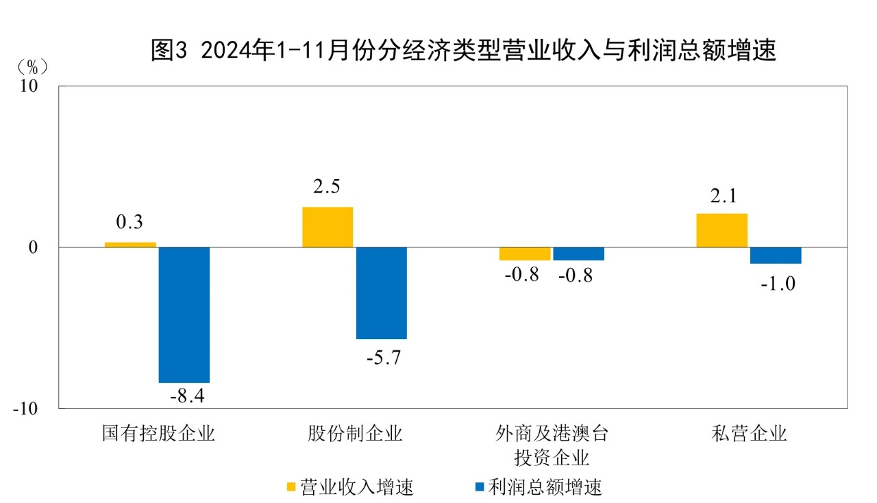 1—11月份,規(guī)模以上工業(yè)企業(yè)中,國有控股企業(yè)實現(xiàn)利潤總額20387.7億元,同比下降8.4%;股份制企業(yè)實現(xiàn)利潤總額50143.0億元,下降5.7%;外商及港澳臺投資企業(yè)實現(xiàn)利潤總額16062.9億元,下降0.8%;私營企業(yè)實現(xiàn)利潤總額19649.1億元,下降1.0%。