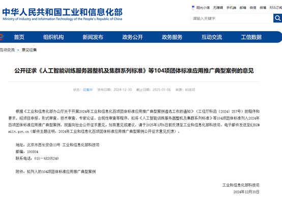工信部12月30日發布消息,根據《工業和信息化部辦公廳關于開展2024年工業和信息化百項團體標準應用推廣典型案例遴選工作的通知》(工信廳科函〔2024〕257號)的程序和要求,經項目申報、形式審查、技術審查、專家論證、合規性審查等程序,擬將《人工智能訓練服務器整機及集群系列標準》等104項團體標準列入2024年百項團體標準應用推廣典型案例,現面向社會公開征求意見。