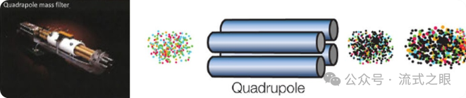 產(chǎn)生的離子云通過真空錐接口進入四極離子偏轉(zhuǎn)器,采用四極桿按照離子的質(zhì)荷比(m/z)對離子進行過濾并富集,去除常見的生物元素離子,只富集含有目標金屬報告離子(根據(jù)質(zhì)荷比大小)的部分(圖2-4)。這樣可以提高后續(xù)質(zhì)譜分析的準確性和特異性,只檢測與抗體結(jié)合的重金屬標記的蛋白質(zhì)離子。