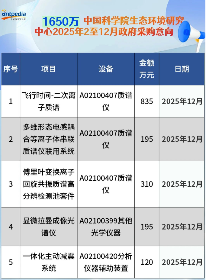 中國科學院生態(tài)環(huán)境研究中心2025年2至12月政府采購意向公開,預算金額共計1655 萬,采購項目5個,含3個質譜儀相關采購項目,1個光譜儀采購項目以及1個分析儀器輔助裝置。