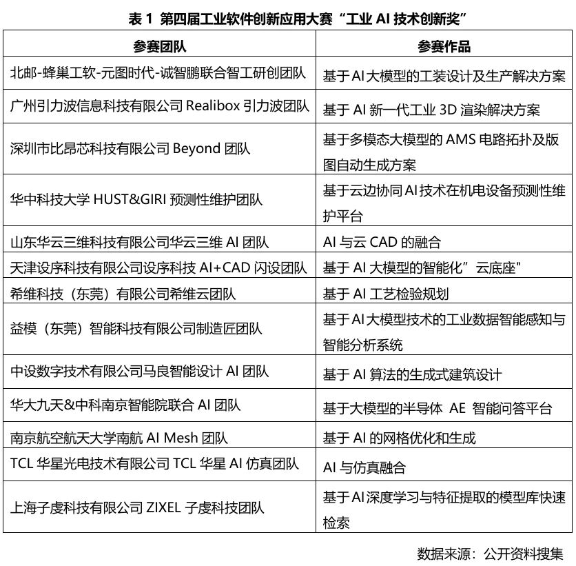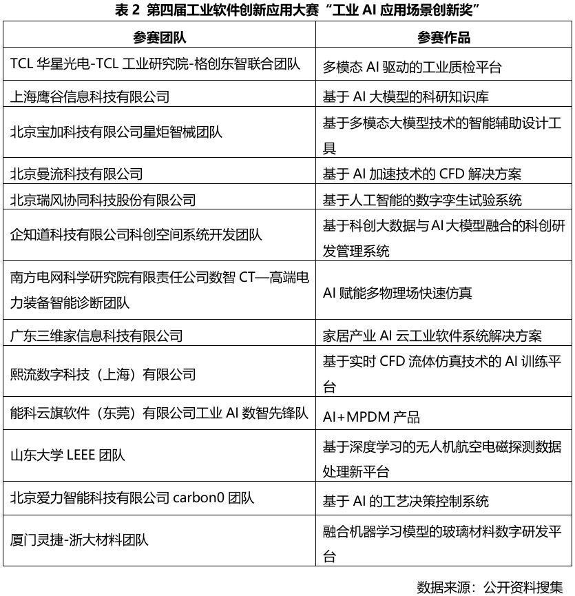 第四屆工業軟件創新應用大賽以“AI+工業軟件”為主題,涌現出一大批優秀的AI創新與應用項目,有98家隊伍參與比賽,有41支隊伍入圍決賽,13支隊伍獲得技術創新獎,13支隊伍獲得應用場景創新獎。