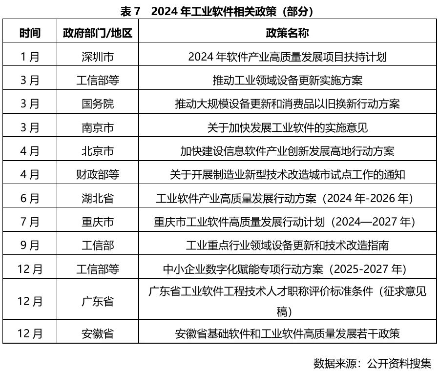 2024年,工信部等多部委、各地方政府進一步出臺工業軟件相關政策,其中《工業重點行業領域設備更新和技術改造指南》提出了2027 年完成約 200 萬套工業軟件和 80 萬臺套工業操作系統更新換代任務。