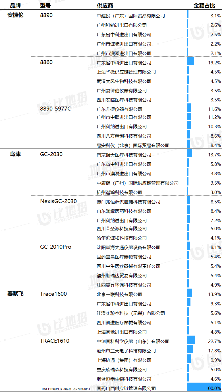 主要供應(yīng)商及對應(yīng)中標(biāo)品牌包括:中建投(廣東)國際貿(mào)易有限公司(安捷倫),南京錦天醫(yī)療科技有限公司(島津),北京一聯(lián)科技有限公司(賽默飛)等。