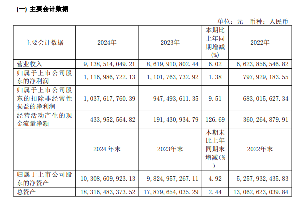 該公司營業收入達91.39億元,同比增長6.02%;歸母凈利潤為11.17億元,同比增長1.38%;扣非歸母凈利潤10.38億元,同比增長9.51%。