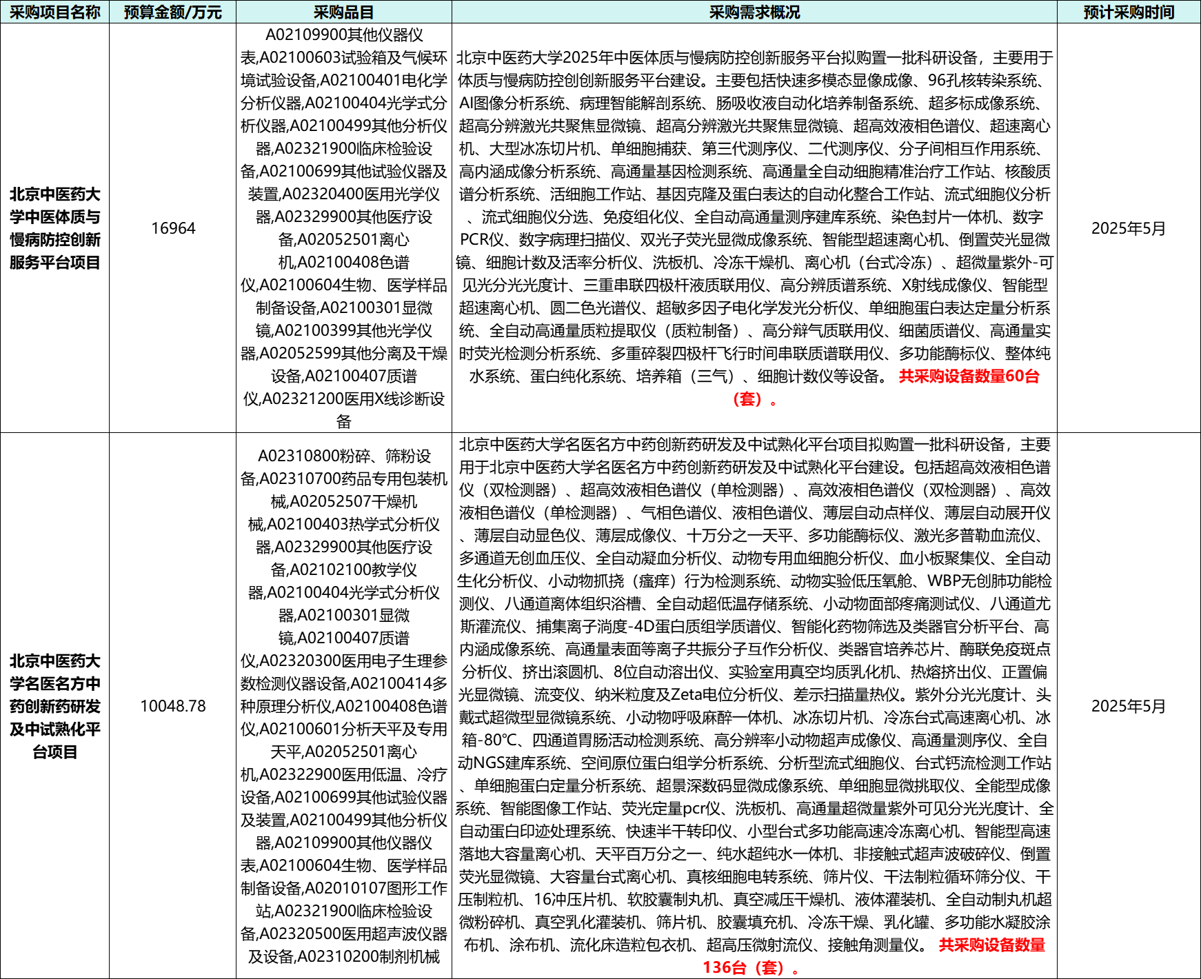 4月25日,北京中醫(yī)藥大學(xué)在中國(guó)政府采購(gòu)網(wǎng)連續(xù)發(fā)布兩項(xiàng)采購(gòu)意向,采購(gòu)金額總計(jì)為27012.78萬元。此前,北京中醫(yī)藥大學(xué)名醫(yī)名方中藥創(chuàng)新藥研發(fā)及中試熟化平臺(tái)項(xiàng)目計(jì)劃采購(gòu)的10048.78萬元項(xiàng)目,隨后,北京中醫(yī)藥大學(xué)再就北京中醫(yī)藥大學(xué)中醫(yī)體質(zhì)與慢病防控創(chuàng)新服務(wù)平臺(tái)項(xiàng)目發(fā)布16964萬元采購(gòu)項(xiàng)目,且計(jì)劃采購(gòu)日期為5月份。仔細(xì)梳理兩個(gè)項(xiàng)目擬采購(gòu)的儀器設(shè)備發(fā)現(xiàn),本次擬采購(gòu)的儀器設(shè)備除涵蓋色譜、質(zhì)譜等大型分析類儀器,光學(xué)儀器、前處理儀器以及生化分析儀器等也在本次擬采購(gòu)范圍之內(nèi)。詳細(xì)信息如下: