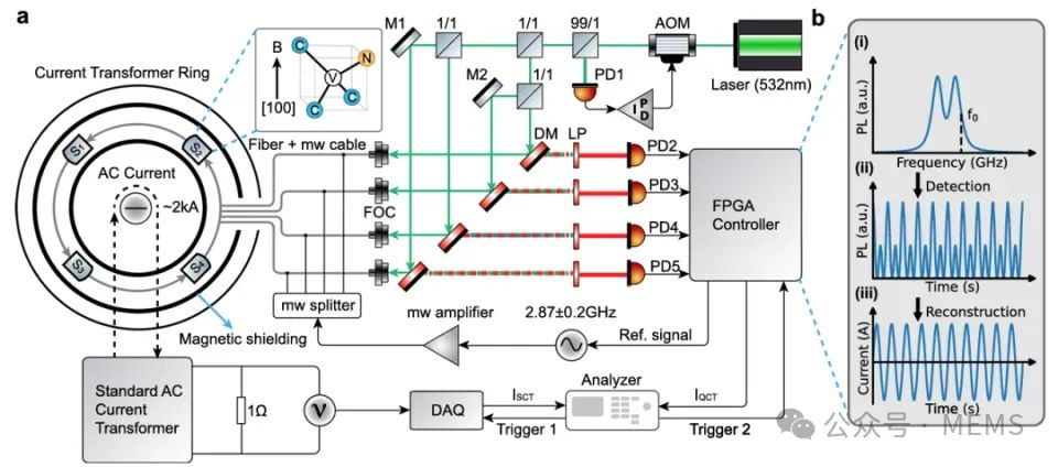 孫方穩(wěn)團隊長期開展金剛石量子傳感器件的加工制備研究,攻克了系列關鍵技術。為了解決電流測量難題,此次研究中團隊采用光纖-金剛石傳感器進行高壓電流測量,四個集成化金剛石量子傳感器均勻分布在磁屏蔽環(huán)中,其[100]晶向與交流磁場平行以提高信噪比。研究提出了在零偏置磁場下對熒光信號進行倍頻轉換和加權平均的處理方法,該方法能夠重構50赫茲交流電的波形;同時,為了拓寬電流測量動態(tài)范圍,采用共振頻率跟蹤方法,保持金剛石傳感器對不同大小電流導致磁場變化的敏感性;針對實際應用中系統(tǒng)溫度變化影響測量精度的問題,通過雙頻量子控制方法可抑制溫度漂移;最后在0至1000安培范圍內進行電流測量,將測量結果與標準電流互感器進行對比,實現(xiàn)了0.05%的測量精度。