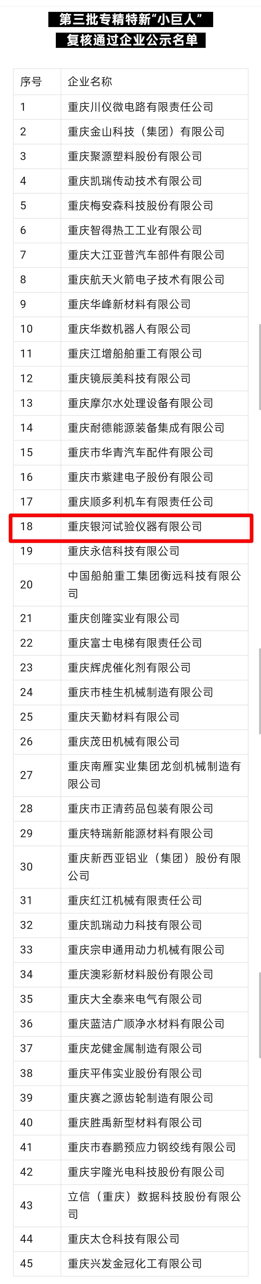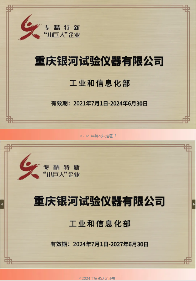2024年9月2日,重慶市經濟和信息化委員會公示了通過審核的企業名單,重慶銀河試驗儀器有限公司在第三批專精特新“小巨人“復核通過企業公示名單中。