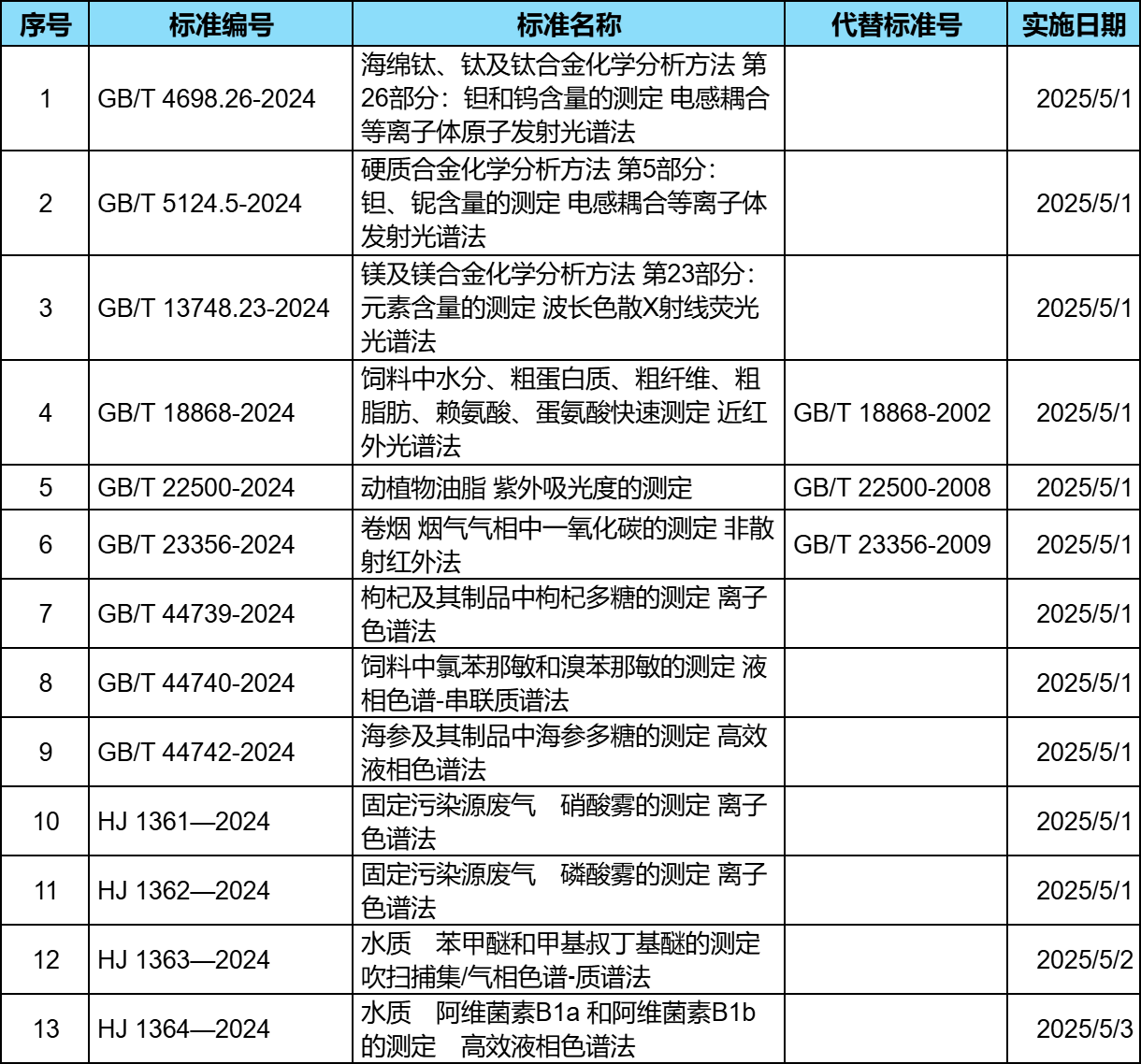 2025年5月1日,一批涉及色譜、質譜、光譜等分析測試方法的國家標準正式實施。這些標準廣泛應用于食品、化工、地質、環境等個領域,旨在進一步規范分析測試技術,提升行業檢測能力和科學性。