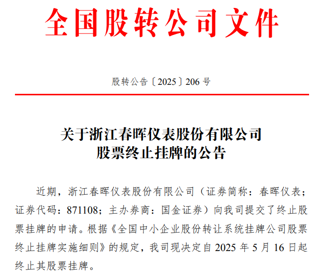 2025 年 5 月 13 日,全國中小企業(yè)股份轉讓系統(tǒng)有限責任公司發(fā)布股轉公告〔2025〕206 號,宣布浙江春暉儀表股份有限公司(證券簡稱:春暉儀表)向其提交了終止股票掛牌的申請。依據《全國中小企業(yè)股份轉讓系統(tǒng)掛牌公司股票終止掛牌實施細則》規(guī)定,全國股轉公司決定自 2025 年 5 月 16 日起終止春暉儀表股票掛牌。