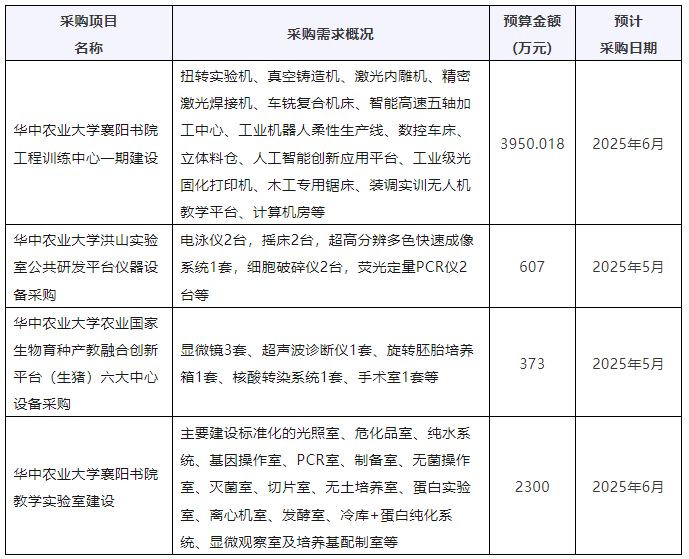 近期,華中農業大學連續發布多項儀器采購意向,預算總金額7230.018萬元。涉及儀器設備包括電泳儀、超高分辨多色快速成像系統、細胞破碎儀、旋轉胚胎培養箱等。預計采購時間2025年5月~6月。