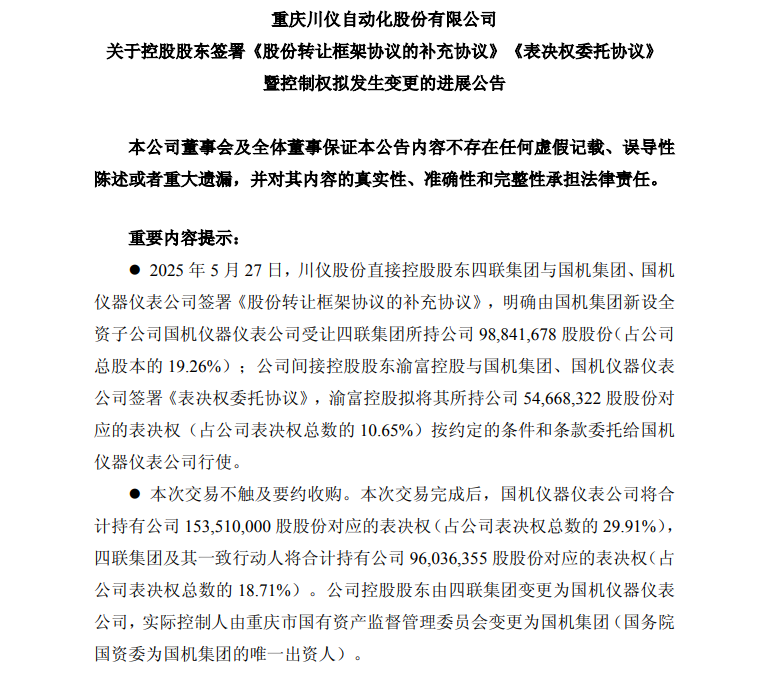 5月27日晚間,川儀股份(603100)公告,5月27日,公司直接控股股東四聯(lián)集團與國機集團、國機儀器儀表公司簽署《股份轉(zhuǎn)讓框架協(xié)議的補充協(xié)議》,明確由國機集團新設(shè)全資子公司國機儀器儀表公司受讓四聯(lián)集團所持公司98,841,678股股份(占公司總股本的19.26%);公司間接控股股東渝富控股與國機集團、國機儀器儀表公司簽署《表決權(quán)委托協(xié)議》,渝富控股擬將其所持公司54,668,322股股份對應(yīng)的表決權(quán)(占公司表決權(quán)總數(shù)的10.65%)按約定的條件和條款委托給國機儀器儀表公司行使。