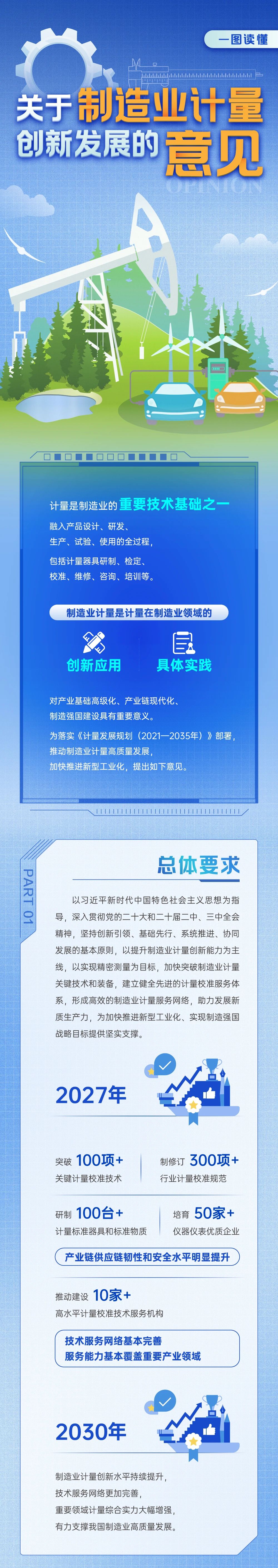 《意見》是制造業(yè)計(jì)量領(lǐng)域首個(gè)政策性文件,堅(jiān)持創(chuàng)新引領(lǐng)、基礎(chǔ)先行、系統(tǒng)推進(jìn)、協(xié)同發(fā)展的基本原則,以提升制造業(yè)計(jì)量創(chuàng)新能力為主線,以實(shí)現(xiàn)精密測(cè)量為目標(biāo),結(jié)合當(dāng)前產(chǎn)業(yè)現(xiàn)狀和制造業(yè)高質(zhì)量發(fā)展要求,提出到2027年,制造業(yè)計(jì)量發(fā)展取得積極進(jìn)展,突破100項(xiàng)以上關(guān)鍵計(jì)量校準(zhǔn)技術(shù),制修訂300項(xiàng)以上行業(yè)計(jì)量校準(zhǔn)規(guī)范,研制100臺(tái)套以上計(jì)量器具和標(biāo)準(zhǔn)物質(zhì),產(chǎn)業(yè)鏈供應(yīng)鏈韌性和安全水平明顯提升,培育50家以上儀器儀表優(yōu)質(zhì)企業(yè),推動(dòng)建設(shè)10家以上制造業(yè)高水平計(jì)量校準(zhǔn)技術(shù)服務(wù)機(jī)構(gòu),技術(shù)服務(wù)網(wǎng)絡(luò)基本完善,服務(wù)能力基本覆蓋重要產(chǎn)業(yè)領(lǐng)域。到2030年,制造業(yè)計(jì)量創(chuàng)新水平持續(xù)提升,技術(shù)服務(wù)網(wǎng)絡(luò)更加完善,重要領(lǐng)域計(jì)量綜合實(shí)力大幅增強(qiáng),有力支撐我國制造業(yè)高質(zhì)量發(fā)展。